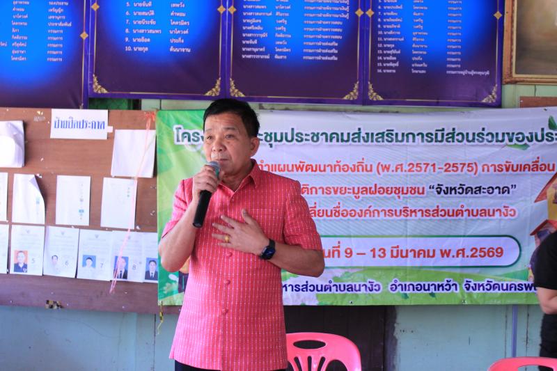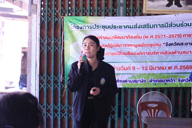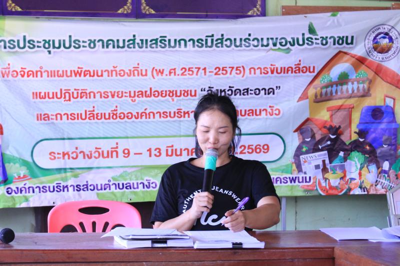 ภาพบรรยากาศโครงการประชุมประชาคมส่งเสริมการมีส่วนร่วมของประชาชน เพื่อจัดทำแผนพัฒนาท้องถิ่น (พ.ศ.2571-2575) การขับเคลื่อนแผนปฏิบัติขยะมูลฝอนชุมชน "จังหวัดสะอาด" การเปลี่ยนแปลงชื่อองค์การบริหารส่วนตำบลนางัว การจัดตั้งโรงเรียนผู้สูงอายุ และการบริการประชาชนของนักพัฒนาชุมชน ระหว่างวันที่ 9 - 13 มีนาคม พ.ศ.2569 โดยเป็นการเดินทางไปตามหมู่บ้านในเขตพื้นที่การปกครองจำนวน 10 หมู่บ้าน ซึ่งเป็นการดำเนินโครงการวันที่ 2 ณ บ้านสามัคคี หมู่ที่ 7 (ช่วงเช้า) บ้านนาคอย หมู่ที่ 13 (ช่วงบ่าย)