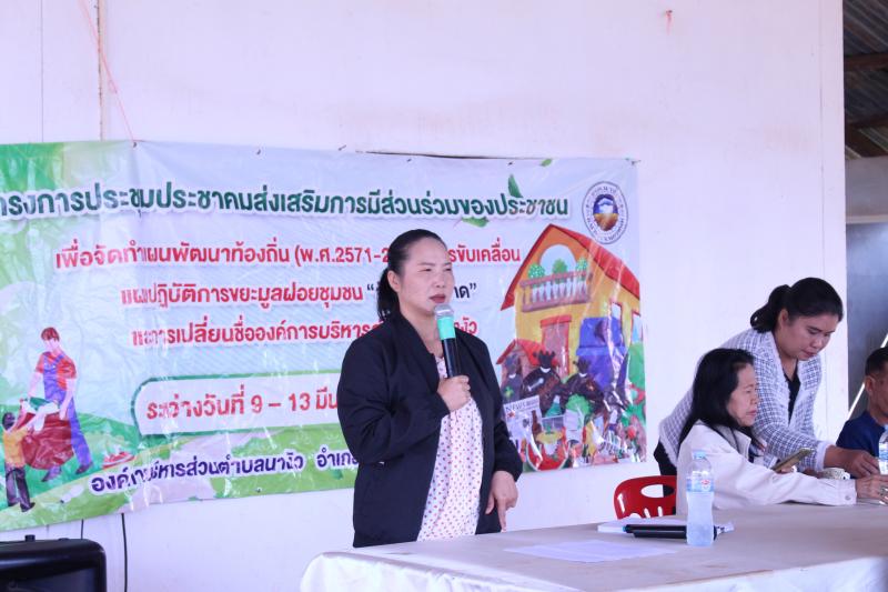 ภาพบรรยากาศโครงการประชุมประชาคมส่งเสริมการมีส่วนร่วมของประชาชน เพื่อจัดทำแผนพัฒนาท้องถิ่น (พ.ศ.2571-2575) การขับเคลื่อนแผนปฏิบัติขยะมูลฝอนชุมชน "จังหวัดสะอาด" การเปลี่ยนแปลงชื่อองค์การบริหารส่วนตำบลนางัว การจัดตั้งโรงเรียนผู้สูงอายุ และการบริการประชาชนของนักพัฒนาชุมชน ระหว่างวันที่ 9 - 13 มีนาคม พ.ศ.2569 โดยเป็นการเดินทางไปตามหมู่บ้านในเขตพื้นที่การปกครองจำนวน 10 หมู่บ้าน ซึ่งเป็นการดำเนินโครงการวันที่ 5 ณ ศาลาประชาคมบ้านอูนนาหมู่ที่ 11
